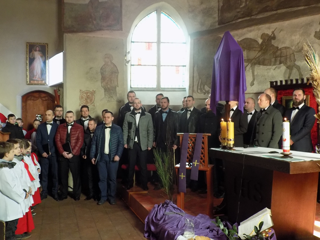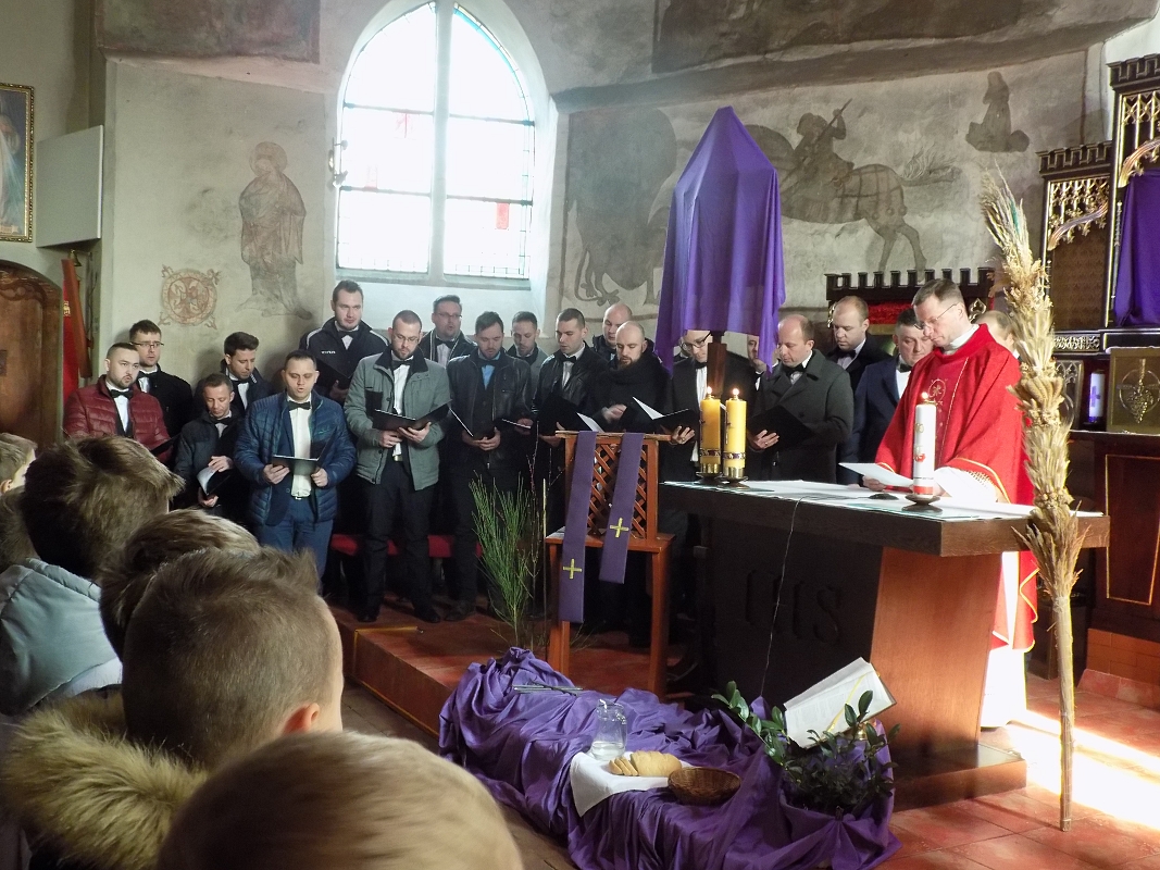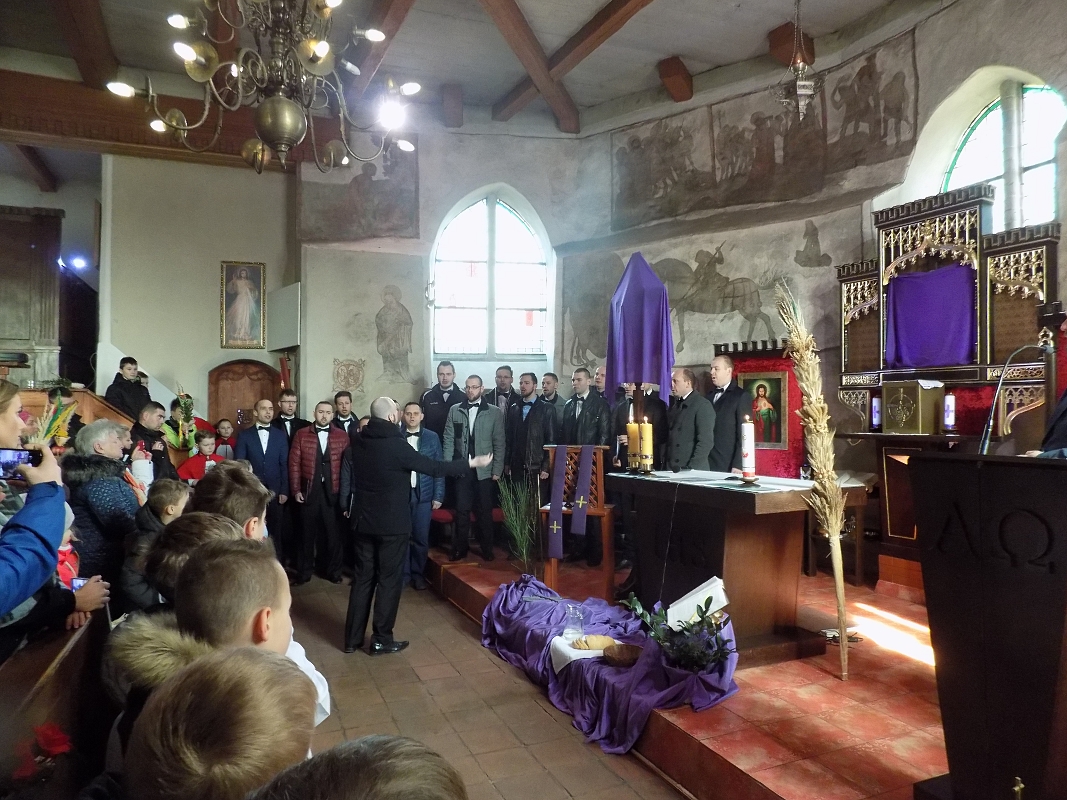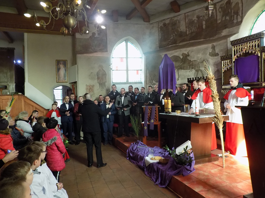 W Grzędzicach nasi Goście odczytali z podziałem na role PASJĘ wg św. Marka, wzięli udział we Mszy św., a po jej zakończeniu dali krótki koncert przeplatany historią powstania i działalności.