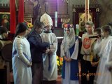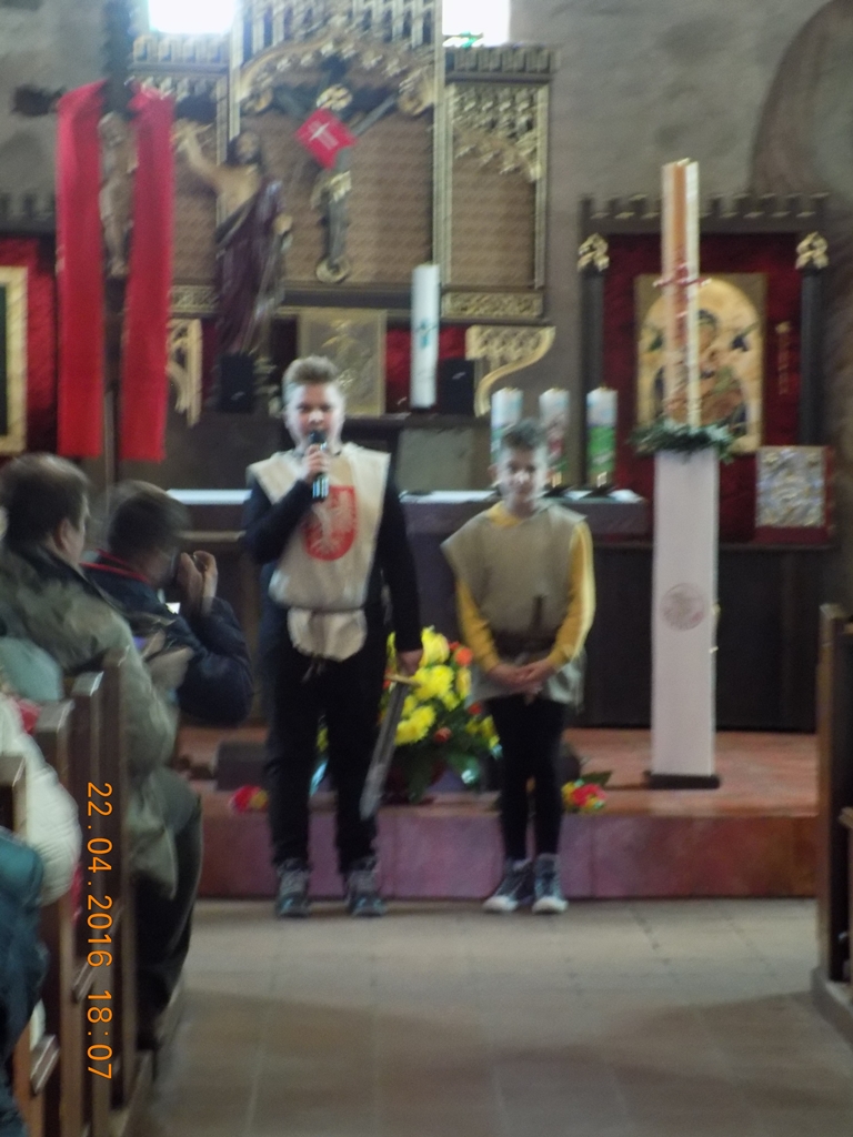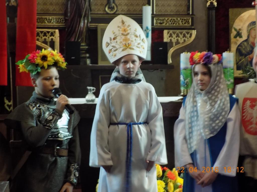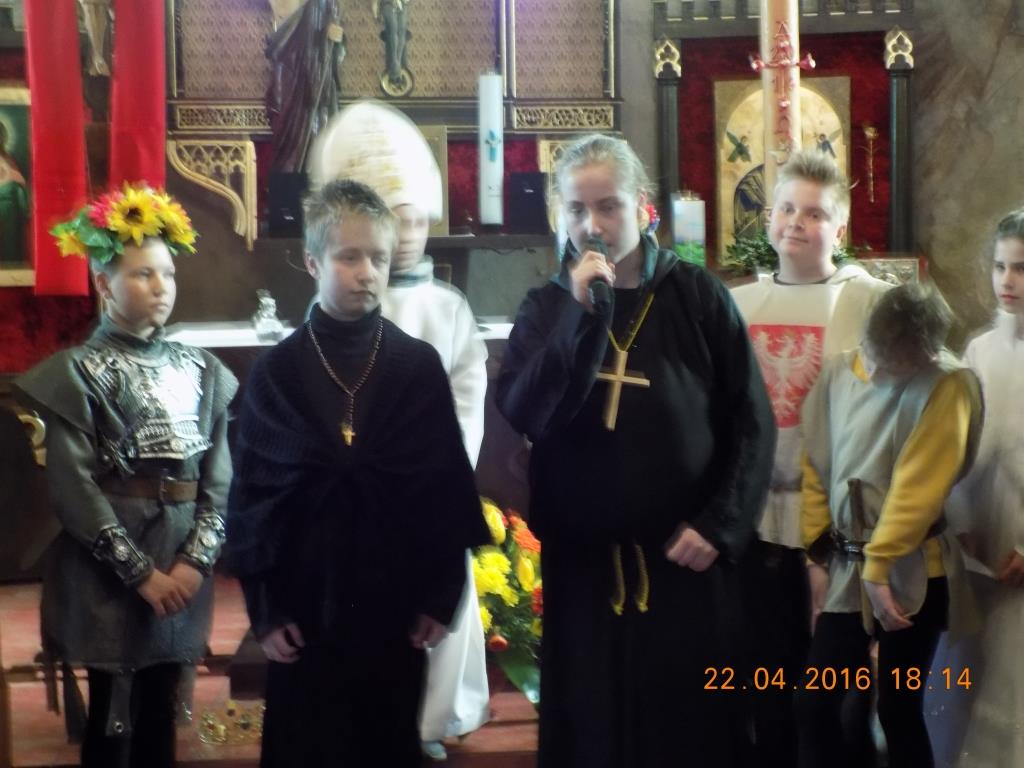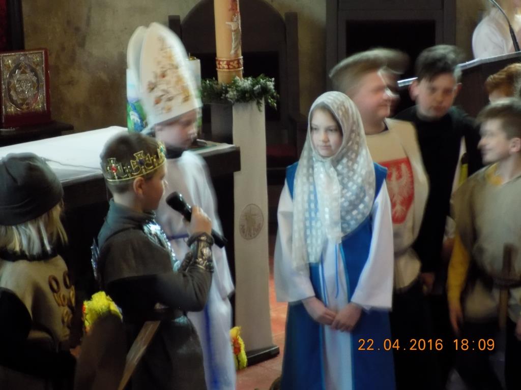 W przygotowanych, historycznych strojach, dzieci naszej szkoły znakomicie przypominały zebranym w kościele wiernym tamten klimat, kiedy to książę Mieszko I, w trosce o losy naszych ziem, przyjął chrzest z rąk biskupa Jordana.