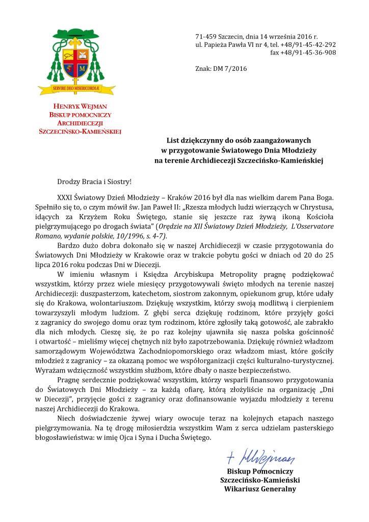 List dziękczynny do osób zaangażowanych w przygotowanie Światowego Dnia Młodzieży na terenie Archidiecezji Szczecińsko-Kamieńskiej od Biskupa Pomocniczego Henryka Wejmana.